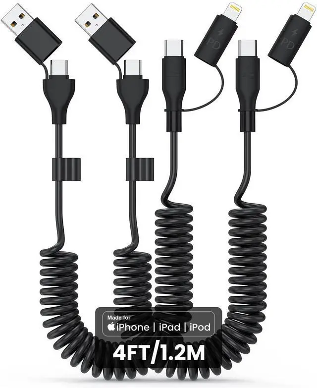2Pack Coiled USB Cable, USB to USB C and Lightning Cable 4-in-1, Car Carplay Cable, 60W 3A Fast Charging Cord for iPhone 17 16 15 14 13 12 11, iPad, MacBook, Galaxy, Note & More - 4ft/Black