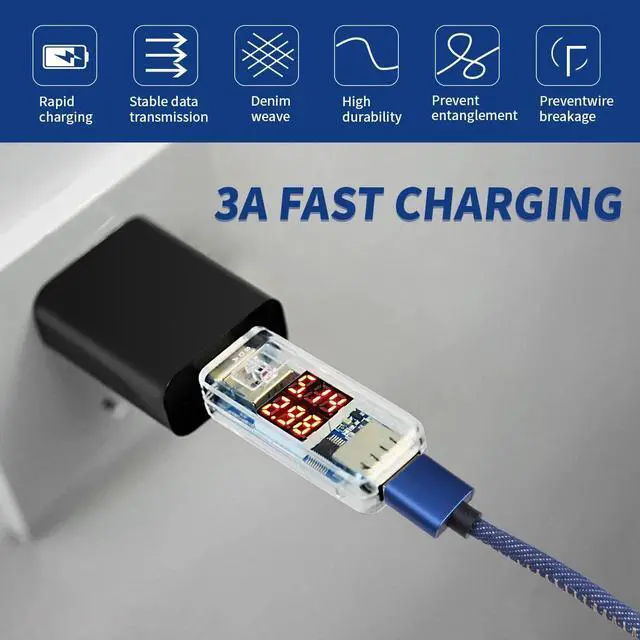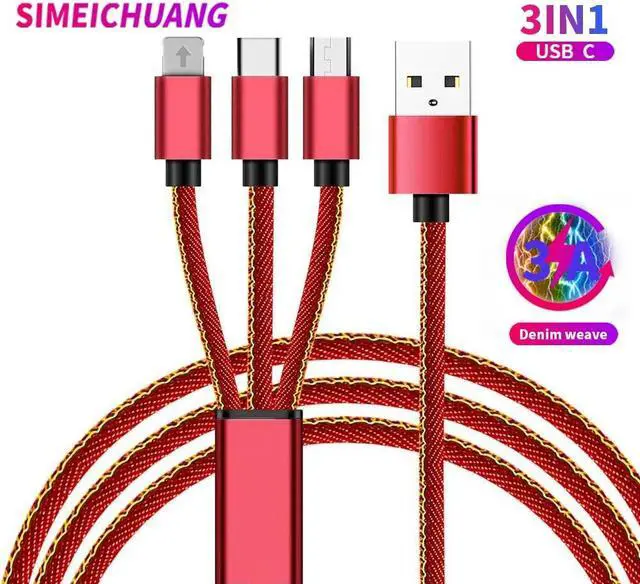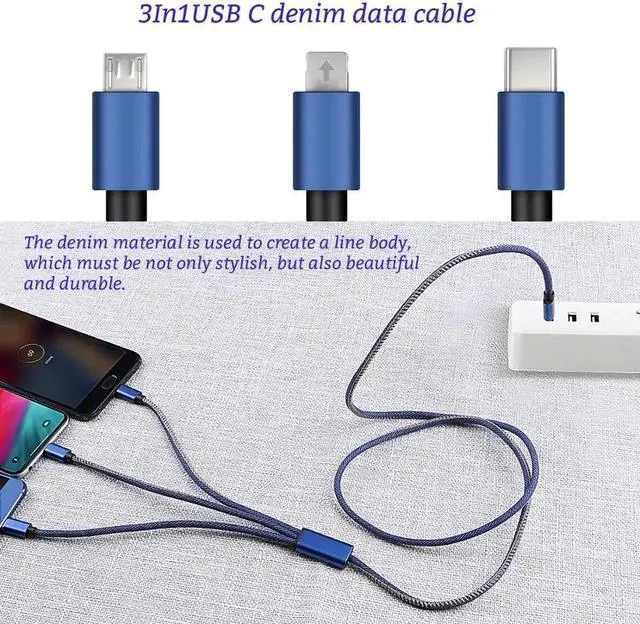 new 3In1USB C denim braided 3A fast charging Type C cable for Android phone Micro USB multifunctional fast chargingMain functions: se three interfaces correspond to a variety of different mole phones. Extreme speed charging and transmission are more convenient and practical.