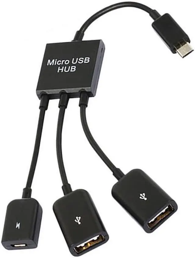One Males Micro USB connects to one Micro USB female and Two USB 2.0 Female for external devices