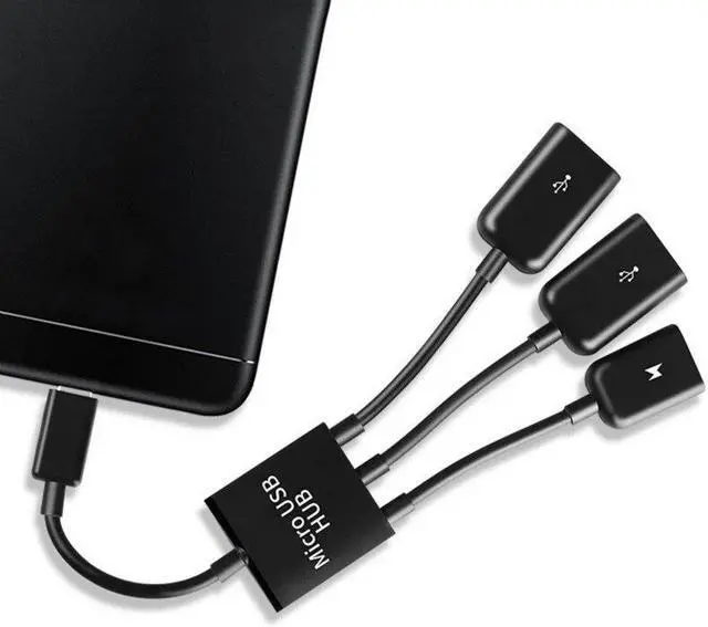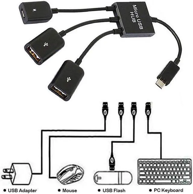 One Males Micro USB connects to one Micro USB female and Two USB 2.0 Female for external devices