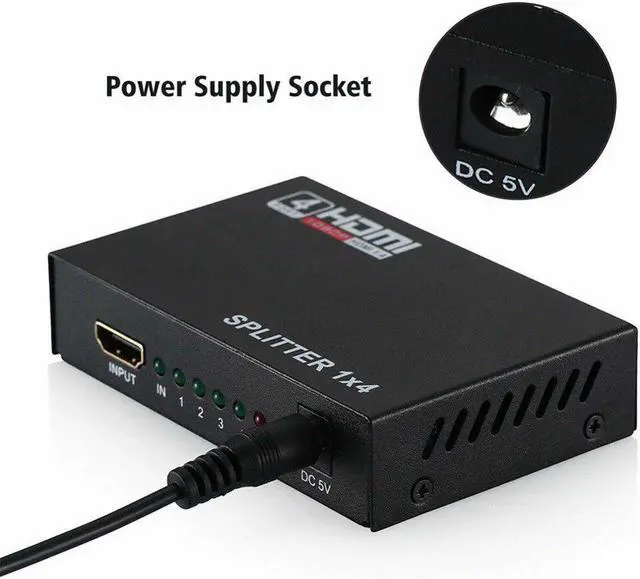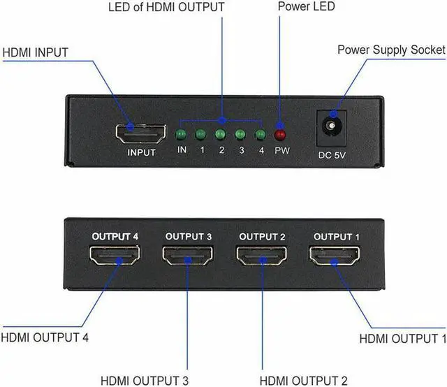 The HDMI splitter enables the distribution of HDMI signals from set-top boxes, DVD players, d-vhs players, and other HDTV devices into a 2/4-way consistent, synchronous HDMI signal output.Users can simultaneously connect the output signal to hd projector, DLP, LCD hd TV and other devices to display synchronously.