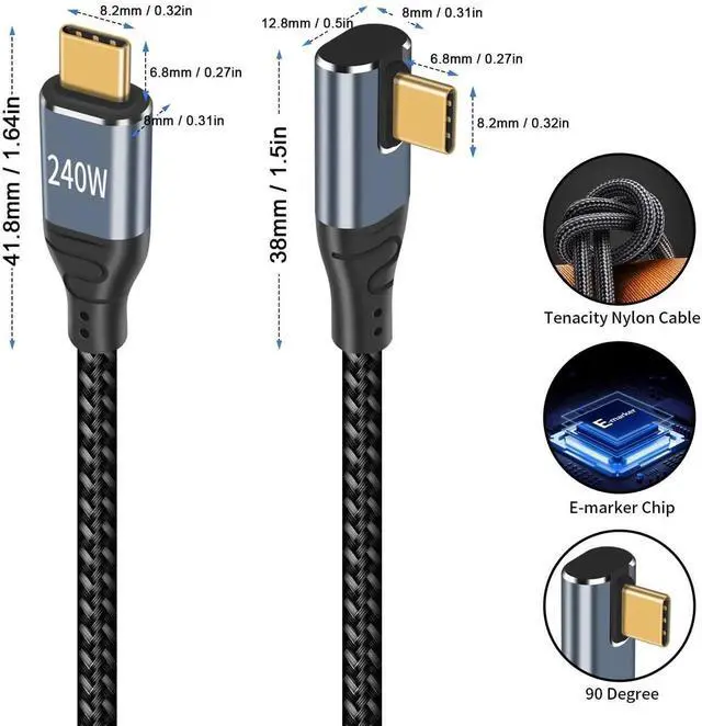 240W Right Angle USB C Cable: This right angle type c charging cable fast charge with an innovative 90 degrees " L " design. It's user-friendly design more convenient and comfortable for playing games, watching videos, reading e-books when you charging.