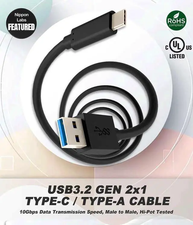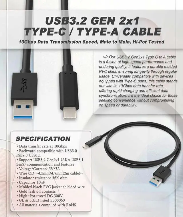 USB Type C 3.2 Gen 2 Male to Type A Male Cable,10G, 3A, BLACK USB Type-C to A Cable 1m