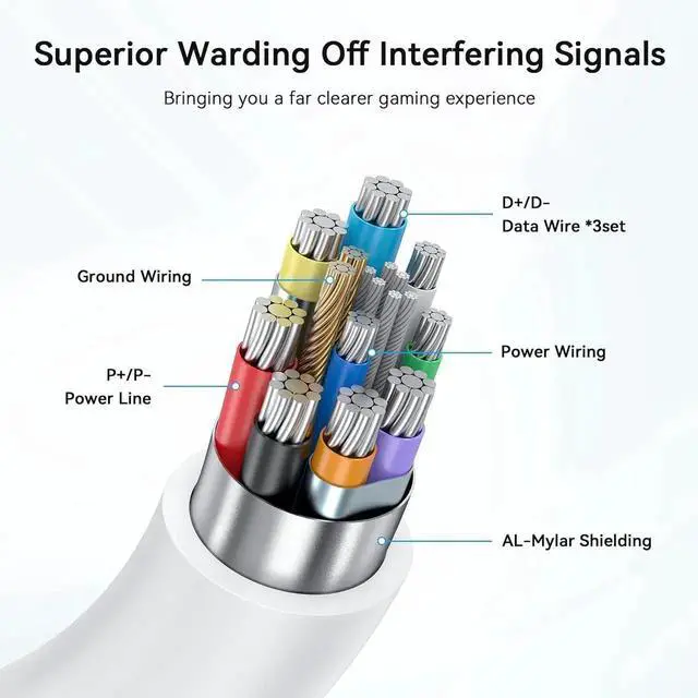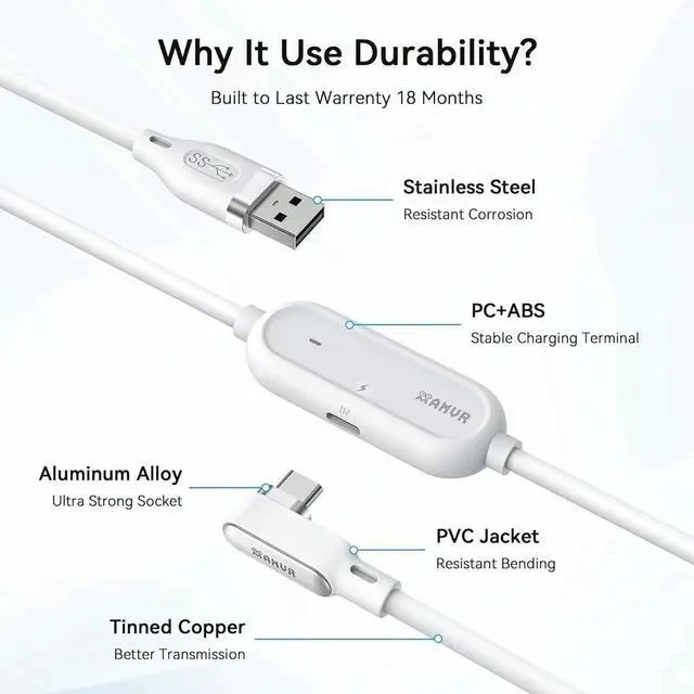 Ultra durable design with double PVC lightweight outer layer cable offers unmatched flexibility and abrasion resistance. Reinforced L-shaped USB-C connectors can withstand the max pulling force of 100N, with better transmission performance in the game. The tough PVC sheath survive 3000+ bends, ensuring longevity even during long term intense movement