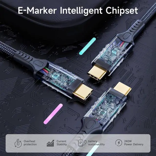 Additional Features- [E-Marker Smart Chips] This USB4 data cable is built with an E-Marker smart chip, which enables intelligent power adjustment based on device requirements. The chip ensures stable and efficient 240W fast charging by optimizing energy delivery. With this smart technology, your devices can charge quickly while staying protected from overcurrent, providing a safe and hassle-free charging experience for your data cable.
