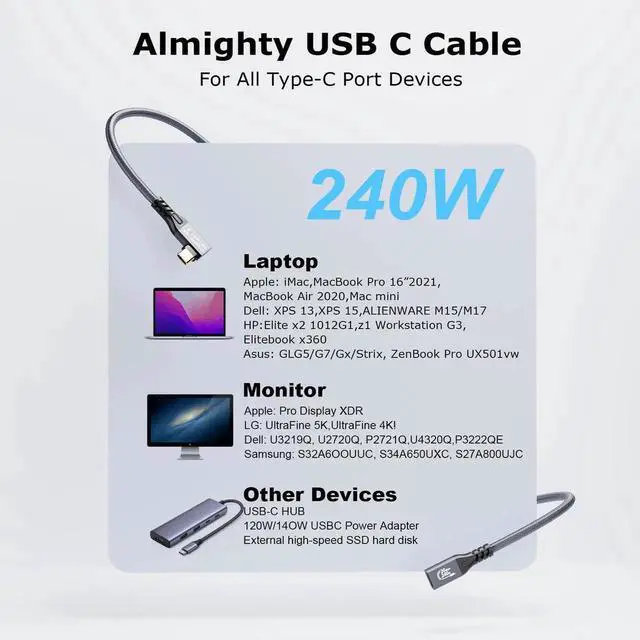 90 Degree 20Gbps USB C 3.2 Extension Cable, USBC 3.2 Gen2 Type-c Male to Female Extender Cable Ultra HD 4K@60Hz 240W Charging 20Gbps Data Transfer Compatible with External SSD eGPU