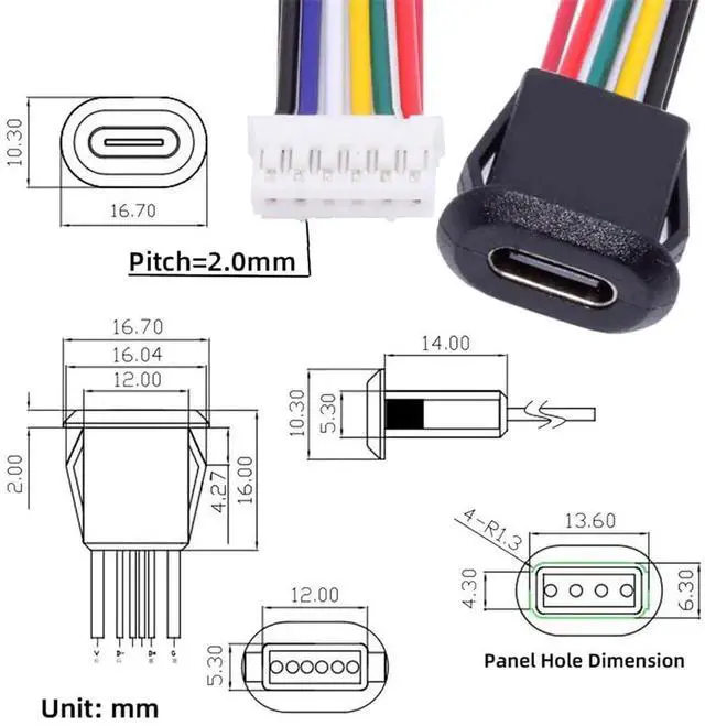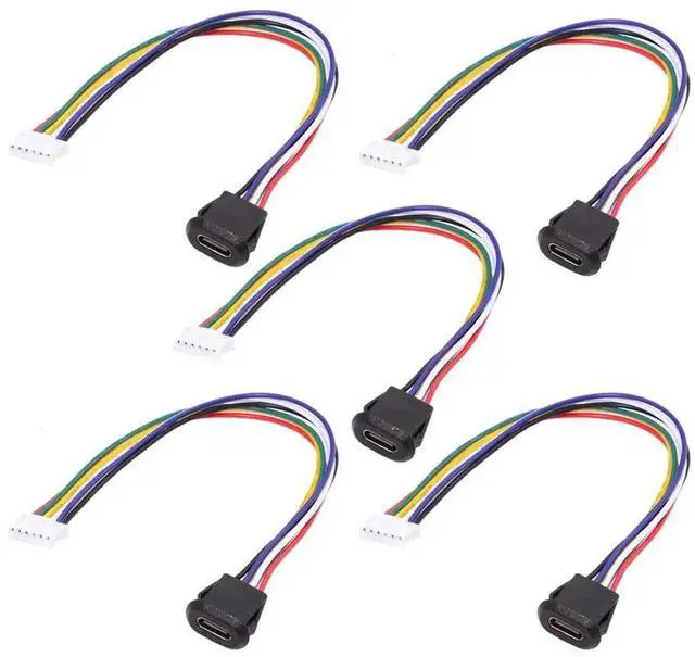 5pcs/set DIY OEM Type C Female Socket to 6Pin Header Cable USB-C to 6P Waterproof Terminal Wire with Pitch=2.0mm Latch Mount Type DC 5V/20V Extension PD Power Cable