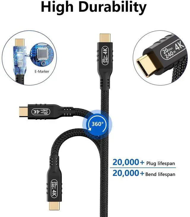 1. [E-Marker Smart Chips] The USB C to USB C cable features an E-Mark chip. This chip is essential as it enables the cable to smartly adapt to different device power needs. It ensures a smooth 240W charging process, making it reliable and efficient. With the E-Mark chip, you can trust that your devices will charge safely and quickly without any hassle.