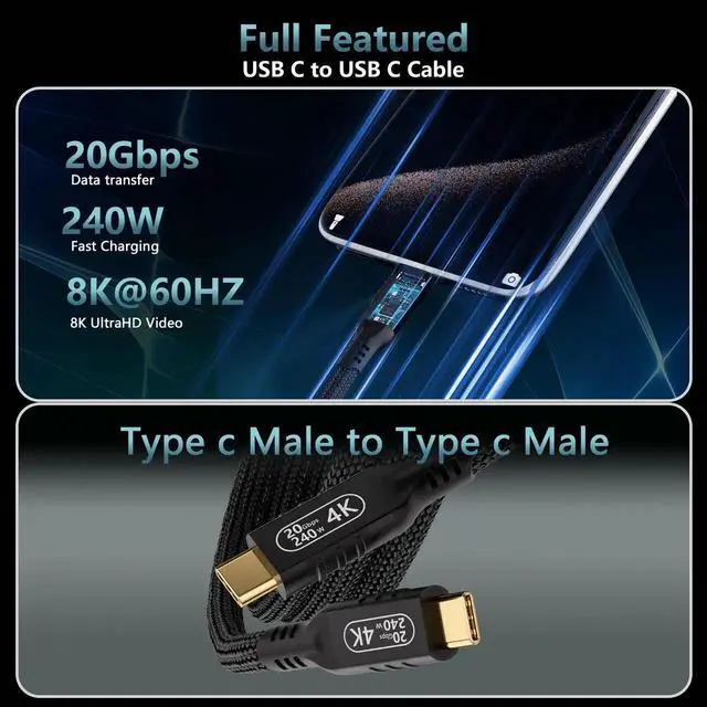 USB c 3.2 gen 2 Data Transfer 20 Gbps Cable 10ft/3musbc Nylon Long Fast Charging Cable 240 watt,USB c 4K Video Cable Compatibile laptops, Smartphone, Monitor.