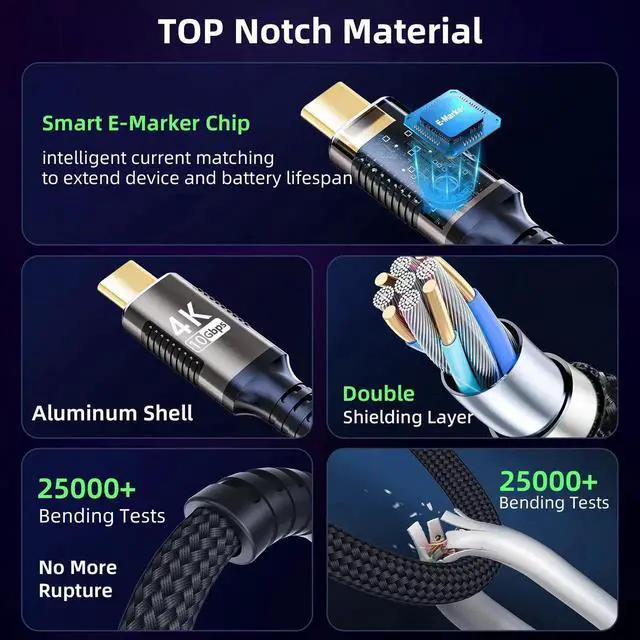 - [Durable · Safe & Worry-Free] This nylon-braided USB-C cable features triple-protection design, withstanding 25,000 bend tests and 3X durability! The aluminum alloy shell resists daily wear, while the 86% tinned copper core with multi-layer foil shielding ensures stable data transfer with enhanced anti-interference. Built-in smart E-marker chip auto-matches device current, regulates voltage to prevent overcharging, extends battery life, and ensures safe chargingperforming reliably in both frequent-plug office and on-the-go scenarios.