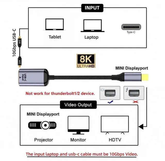 USB-C Type C Female Source to Mini Displayport Sink HDTV cable 8K@60hz 4K@120hz for Tablet Laptop