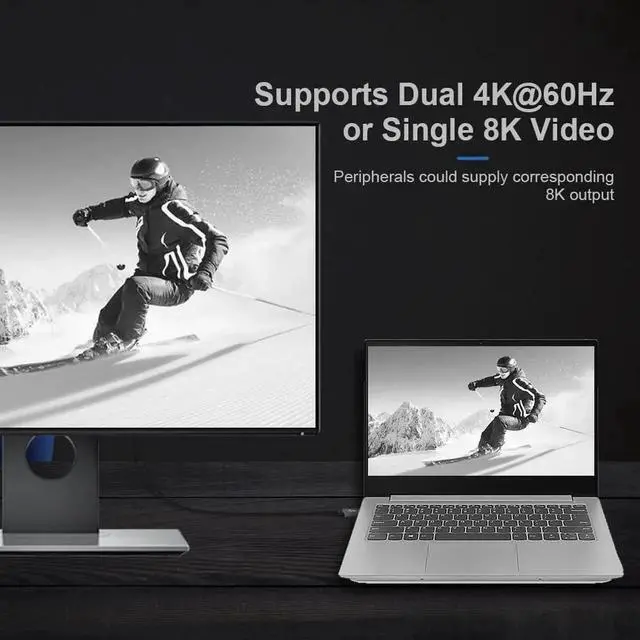 It supports Single 8K@60hz, 5K@60Hz or 4K@60Hz max. video Resolution in your external displays.
