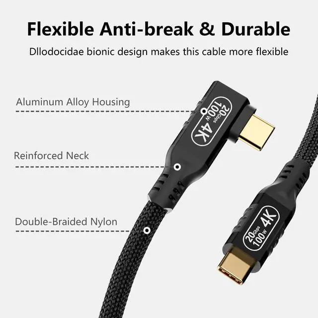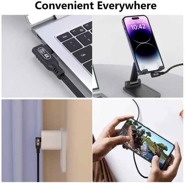 - Right Angle Connector: Enhanced Usability and Protection Our USB C cable's 90-degree connector is a smart design. It gives the thunderbolt cable an ideal alignment, sitting flush instead of protruding sideways. This shields the plug from bumps, protecting it and your device's ports, reducing wear and tear. It's also great for desktop cable management. In a cluttered workspace, the angled connector allows for neater routing, preventing tangles. You can focus on seamless data transfer and charging, enjoying a tidier setup for work or play.