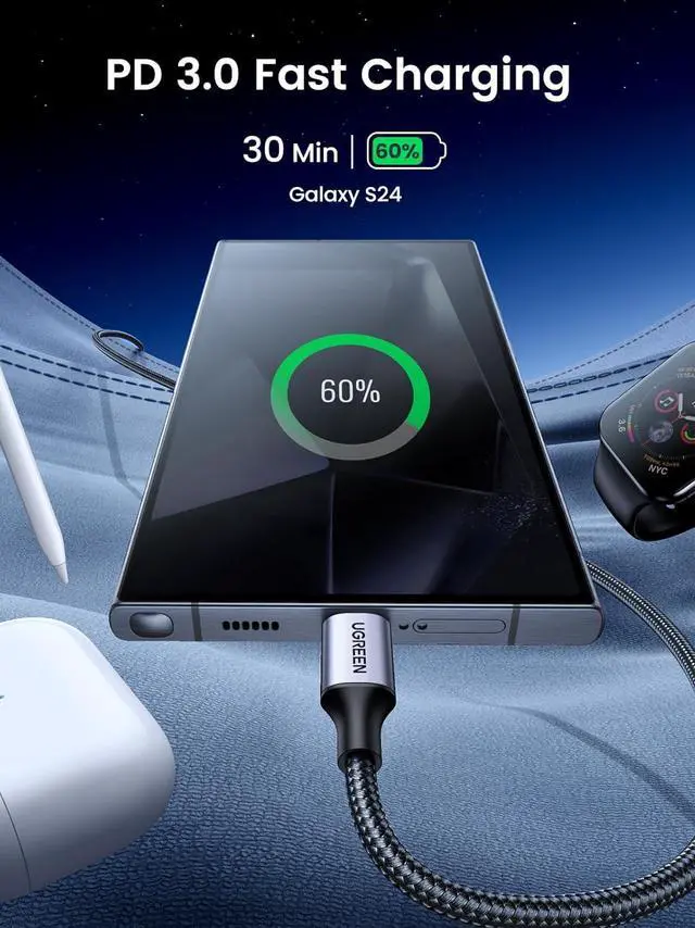 USB C: Equipped with PD 3.0, this USB C cable can achieve 60W fast charging. When paired with a USB-C charger, it can charge MacBook Air from 0% to 78% in one hour. Backward compatible with 20W/30W/45W/65W chargers.