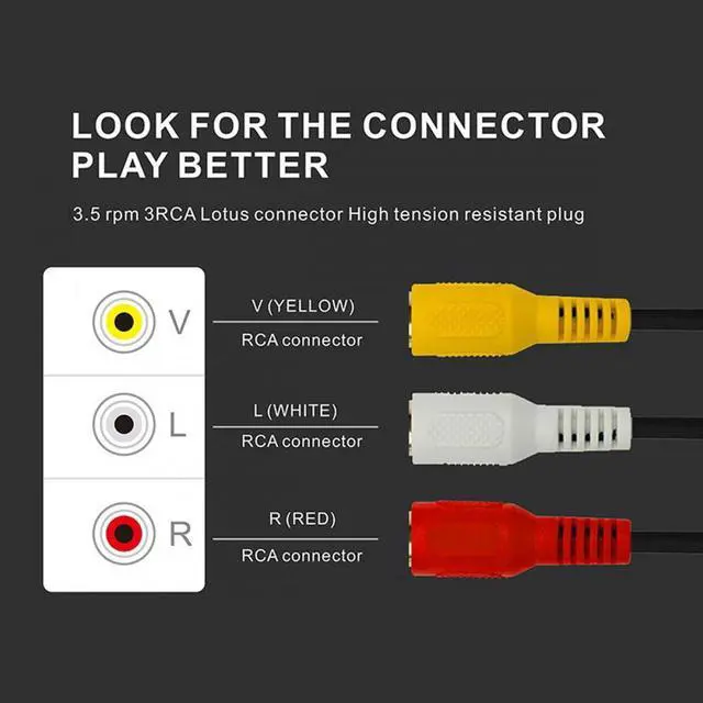3.5mm mini AV to 3 RCA (Phono) cable. Connects a camcorder video and stereo audio output to a TV, monitor or video capture card input.