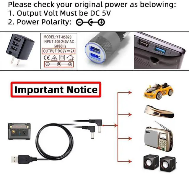 1) Please make sure that the 5V input voltage of power supply is consistent with the voltage required by your equipment, and the inconsistency may cause the equipment to burn down.