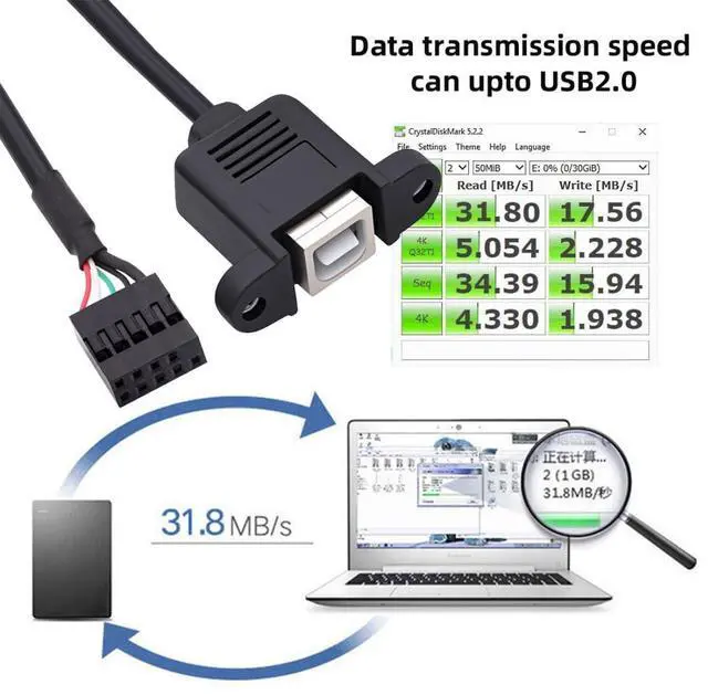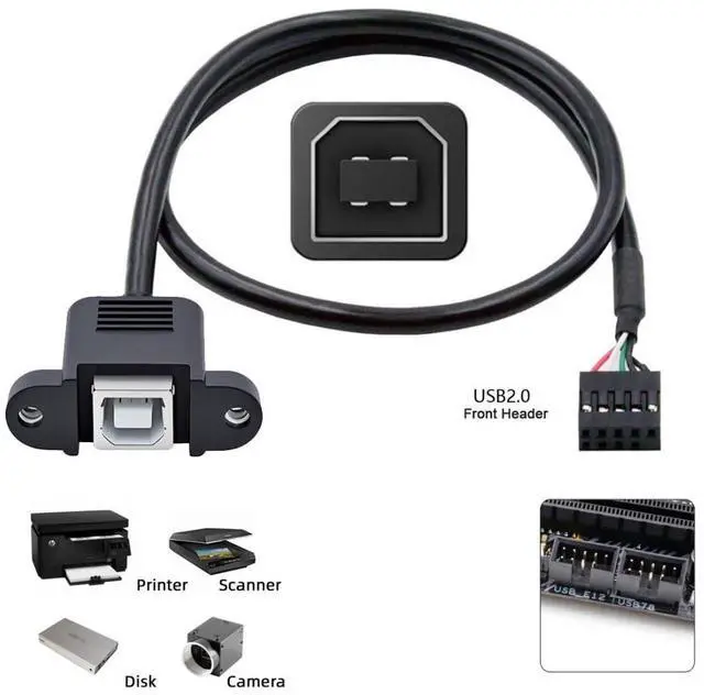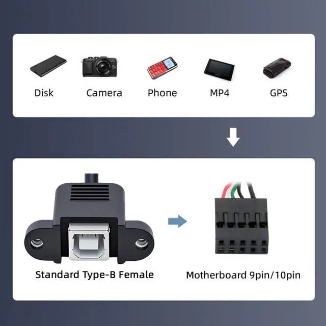 1) You can convert the 9pin motherboard internal usb 2.0 port to type-B device. Used to connect USB type-B cables in tight fit applications.