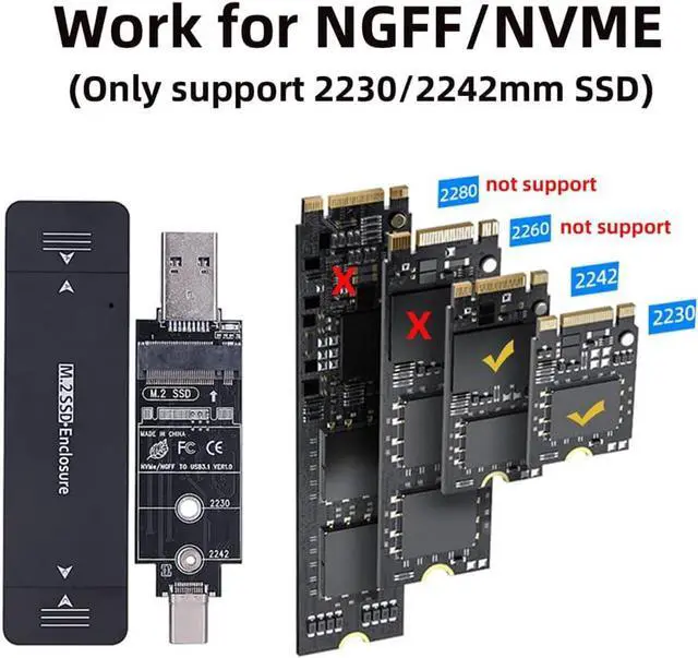It supports a dynamically switching power state with NVMe/SATA/USB power management for power saving mode. Fit 2230/2242mm NGFF/NVME M.2 SSD.(The SSD is not included)