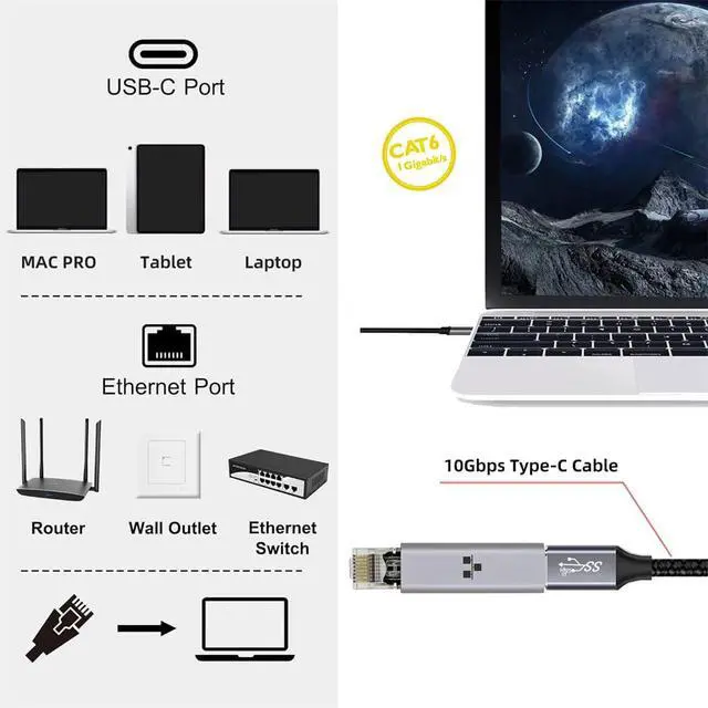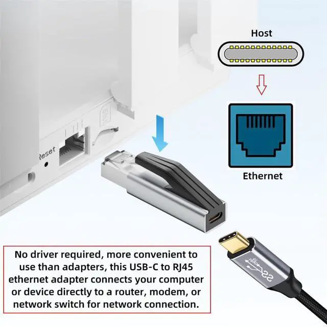 Novel Solution: No driver required, more convenient to use than adapters, this USB-C to RJ45 ethernet adapter connects your computer or device directly to a router, modem, or network switch for network connection. Plug and play, no need to connect through a combination of USB-C to RJ45 adapter and internet adapter. In addition, if your computer's RJ45 port is damaged, this adapter is also an excellent choice for you. (Note : Not console adapter.)