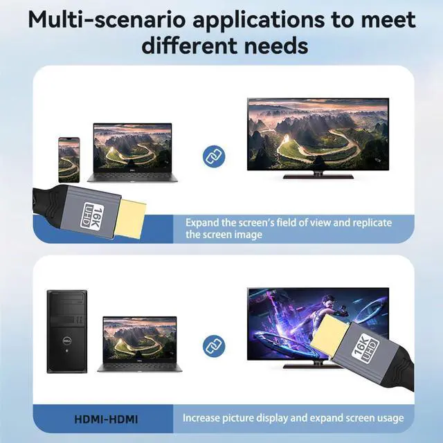 96Gbps bandwidth: This is your all-in-one HDMI cable for the next decade, 16K HDMI cable supports all popular graphics cards and monitors. Unlike 16K/8K/4K/2K HD cables, 16K HDMI2.2 can provide 96Gbps bandwidth, HBR3, DSC 1.2a.