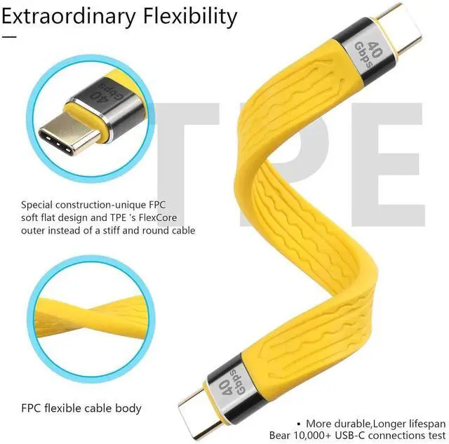 FPC Flat DesignOur short USB-C to USB-C cable is internally made of FPC (Flexible Printed Circuit) and TPE's FlexCore soft sheath, adding extra durability, flexibility We equip USB 4.0 cables with Nickel Metal Connectors - Plated for the most efficient data transfer. Plug and play, you don't have to worry about carrying multiple cables whether you're traveling, working or at home.
