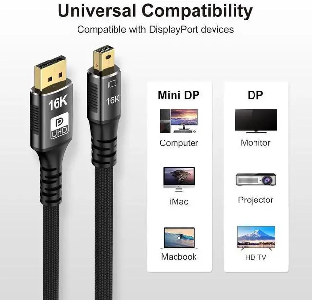 Universal CompatibilityThe 16K connection cable is ideal for devices with Mini DP/Thunderbolt2 port, such as Acer Predator Helios 500, Alienware x17 R2, Dell Precision 7760, NUC11PHKi7CAA, Surface Pro6, Surface Studio, Surface Book, Surface Dock, Surface Laptop2, MacBook Pro Retina 15" 2015, iMac Retina 4K 2015, iMac Retina 5K 2015, Mac mini 2014, Mac Pro 2013. Please check your port carefully before purchasing the Mini Displayport 2.1 Cable.