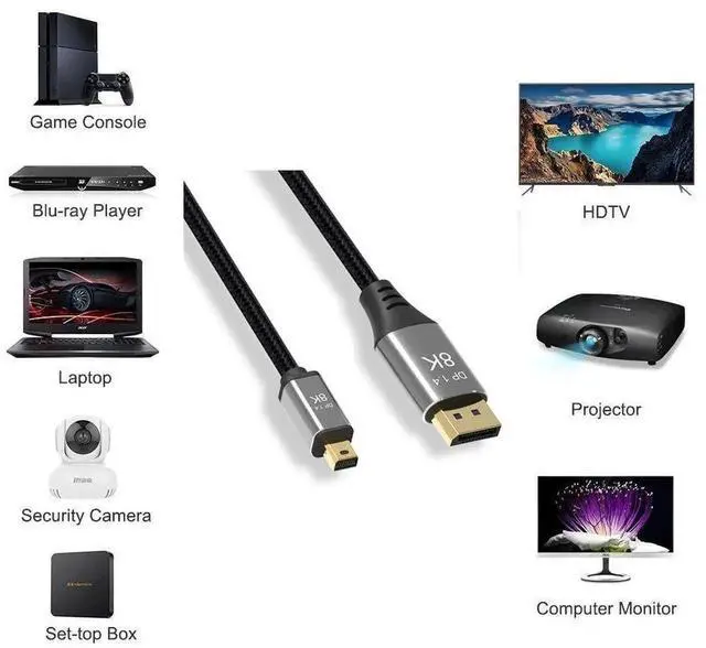 Widely Compatibility and Easily Connection,our Mini DP to DP 8K Cable widely compatible with Macbook Pro,Macbook Air ,Surface Pro,Mac Mini and other mini displayport equipped laptops.While using,directly connecting from your mini dp laptops to your displayport monitors.