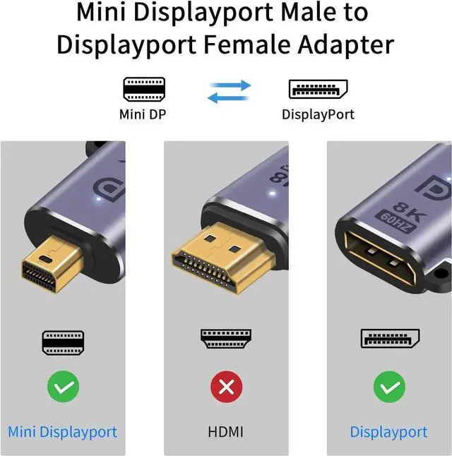 8K Mini Displayport to Displayort Adapter: mainly used to connect a Mini DisplayPort (Mini DP or mDP) port of a compatible computer to a monitor or projector with DisplayPort; A separate DisplayPort cable (sold separately) is required.