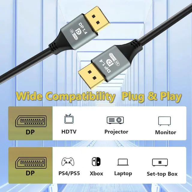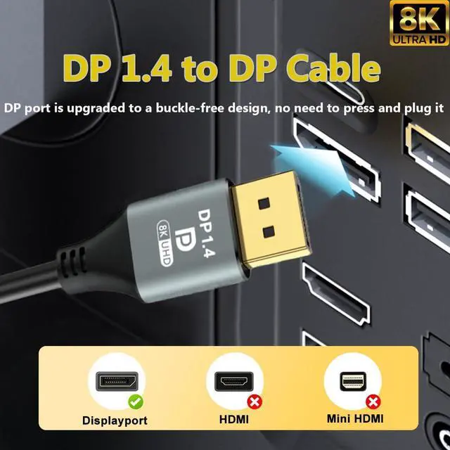 [Video 8K Resolution]: The DisplayPort 1.4 cable supports resolution of 8K Ultra HD up to 60Hz, 2K (2560X1440) up to 165Hz and 1080P (Full HD) up to 165Hz