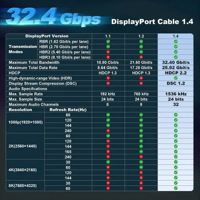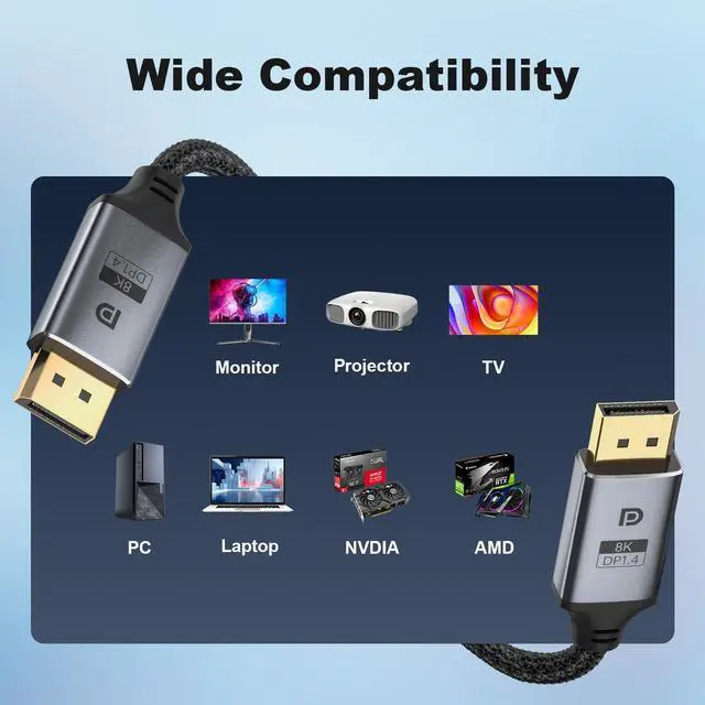 • Great Choice for Gaming Enthusiasts -- Long Displayport 2.1 cable supports 54Gbps of bandwidth, high refresh rate, high resolution, DSC, and dynamic HDR. It also supports FreeSync and G-Sync, which are essential for gaming. Maximizes the performance of your graphics card and monitor without motion blur, screen tearing, or flickering.