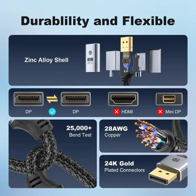 • Durable Optical Displayport Cable -- The DP to DP cable feature gold-plated connectors to prevent oxidation and are protected by a zinc alloy housing. Withstands over 20,000+ bending cycles.