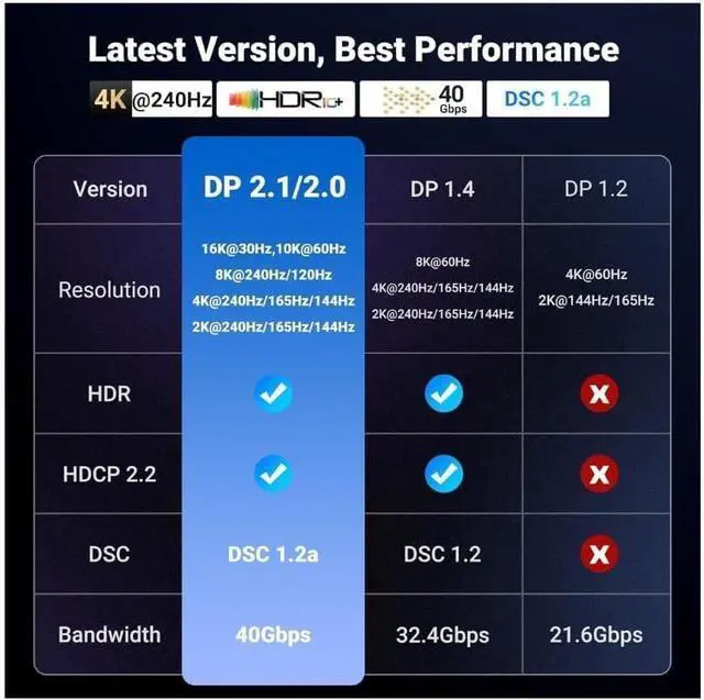 ![Alt view image 5 of 7 - UGREEN 16K DisplayPort Cable 2.1 [VESA Certified] DP2.0 40Gbps Support 8K@240Hz 4K@240Hz HDR, HDCP, DSC 1.2a, Braided Display Port Cable Cord Compatible FreeSync G-Sync Video Card Monitor, 6.6FT](https://c1.neweggimages.com/productimage/nb640/C3P2D2604050OLVY183.jpg)