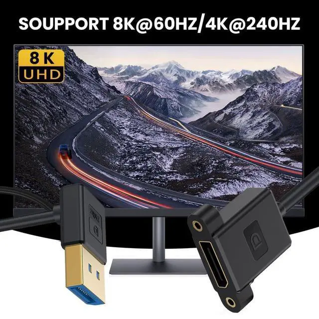 Vszerda DisplayPort 1.4 Cable DisplayPort Male to Female 90 Degree Down Angled 8K@60Hz 4K@240Hz 32.4Gbps High Speed Gold Plated Ultrafine Extension Cable Panel Mount Type 0.98FT/0.3M