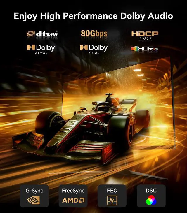 It uses Dynamic HDR, 12-Bit color, 48Gbps bandwidth, VRR, and QFT for lossless video & low latency. Compatible with all HDMI versions, ideal for gaming & streaming.