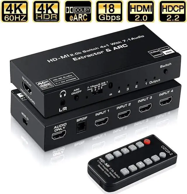 4K 60Hz HDMI 2.0 Switch 4 in 1 Out with Audio Extractor (HDMI, 3.5mm AUX,Toslink Audio Out) and ARC, Support Remote/Auto Switching/HDCP2.2/1080P/3D, HDMI Splitter for TV 4K Home Theater