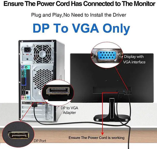 - Active signal conversion required for DP (digital) to VGA (analog)