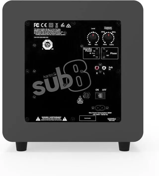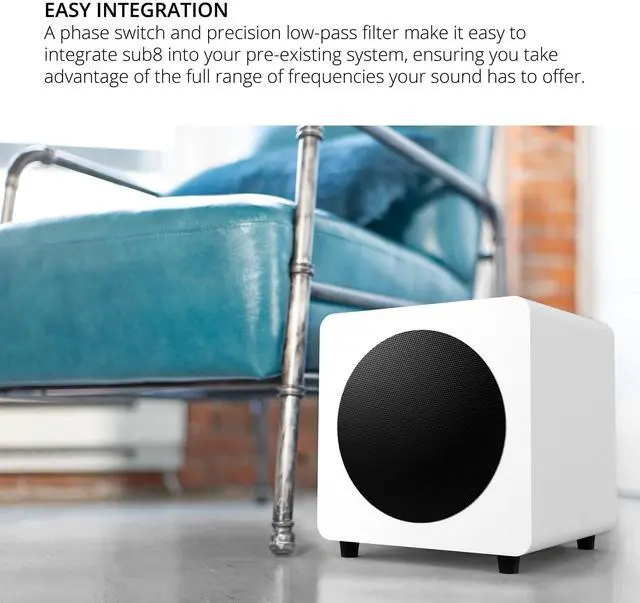 Sub8 gives you the speed and accuracy that only a sealed subwoofer can deliver. An 8 woofer driven by a 300 W amp responds quickly to transients and keeps distortion to a minimum. Its compact size provides full-range sound without sacrificing floor space and a crossover filter and phase control allow for easy integration into any audio system. Sub8 provides worry-free longevity with its rigid MDF construction, solid rubber feet, metal grill, and durable vinyl finish. With matching aesthetics, sub8 is the perfect companion to any Kanto speaker or wherever else tight bass in a tight space is needed.