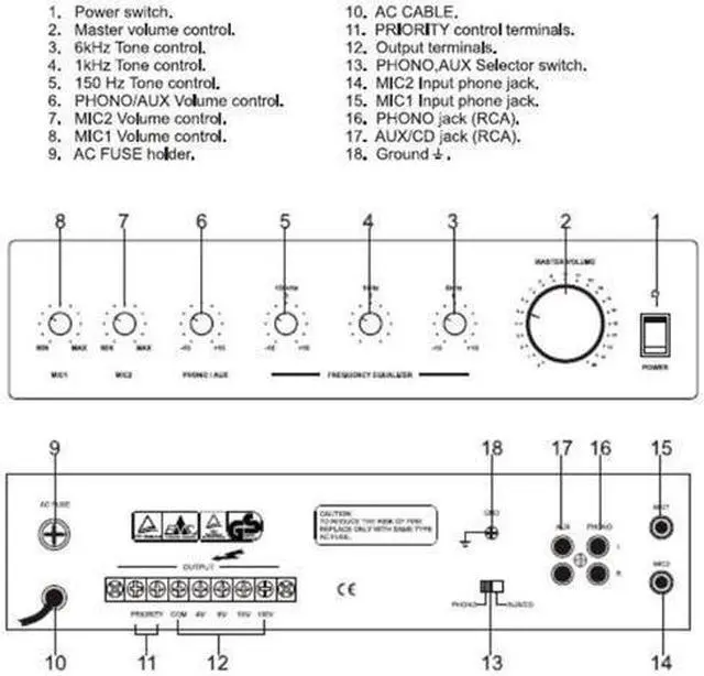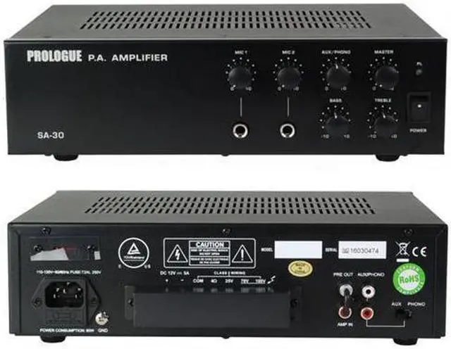 Desktop Mixer Power Amplifier 30W. The SA-30 Mixer Power Amplifiers is a built-in mixer for commercial applications. Two microphone inputs, one AUX or Phone input. MIC input 1 has the Priority function. Two band equaliser. Preamplifier can be separated from the amplification section allowing the use of an external mixer. 4 - 8 ohms and 70v outputs. Output power 30 watts rms. Three prong power cord, 117v. AC or 12v. DC for mobile applications. Heavy duty construction. This low-cost unit provides all necessary features in a simple building-block format.