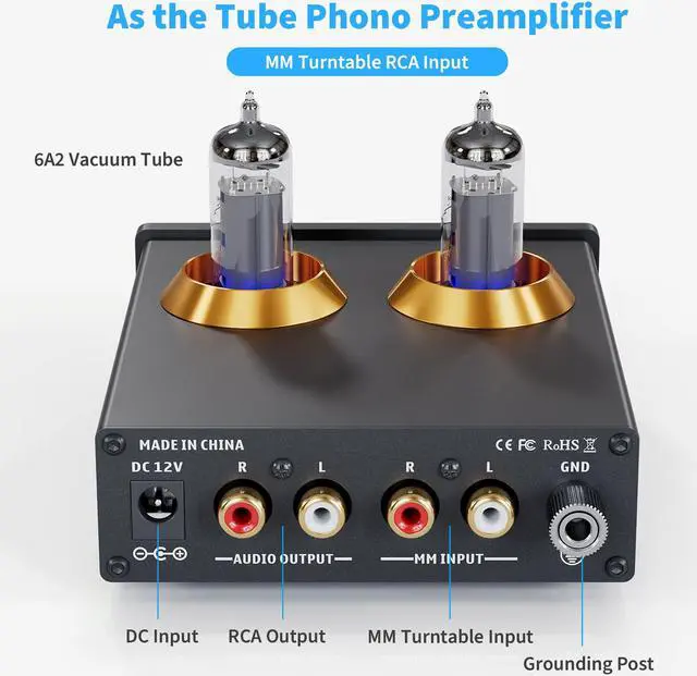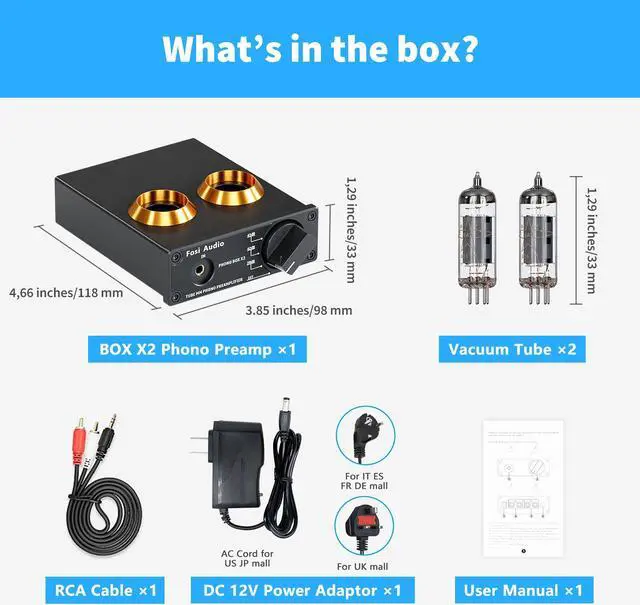 Package Content: You will get 1 x Box X2 phono preamp, 2 x vacuum tubes, 1 x RCA cable, 1 x power adaptor, and 1 x user manual
