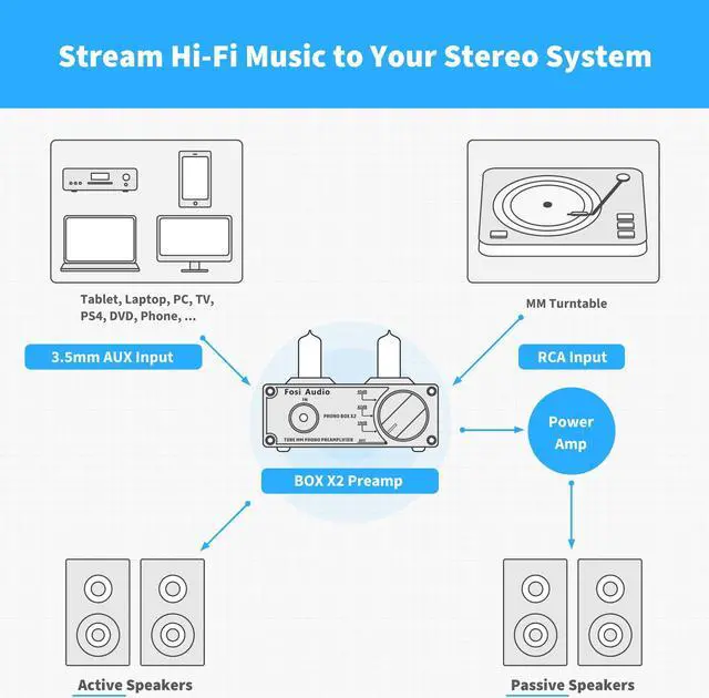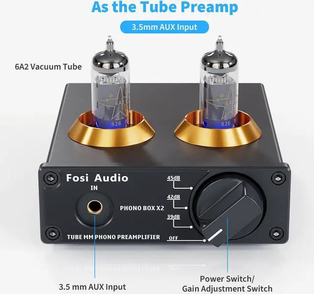 • Tube Preamplifier: With a 3.5mm AUX input, it's also a tube preamp. Fosi Audio used high-quality component parts for the design and assemblage of this phono preamplifier. You can enjoy a very warm and smooth sound