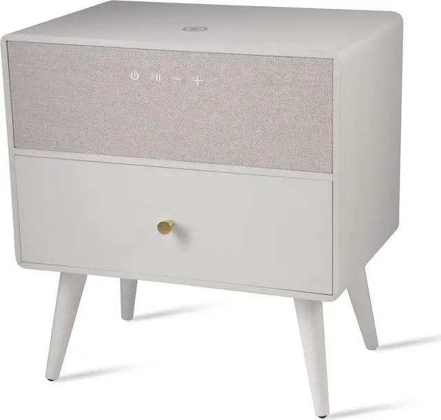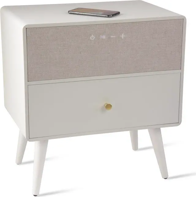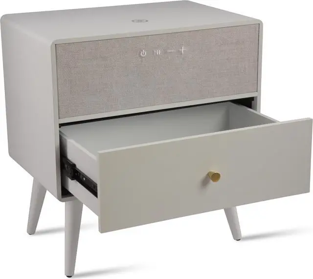 Ralph is our retro design smart side table, in a wood effect and fabric finish. Ralph has a twin Bluetooth connected speaker built into the base, for exceptional sound and a stylish way to play your music. Built into the surface top is a 5W wireless charging plate, which is compatible with all wireless charging devices. Ralph also features a deep drawer for practicality and storage with a stylish gold-effect handle.