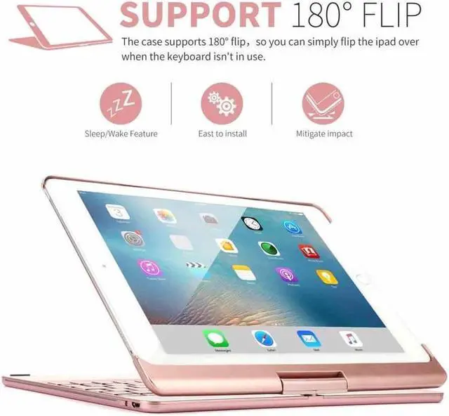 IPad 6/Air 2: A1566/A1567 360 Rotate Stand Keyboard Case and 180 Degree Flip 360 Degree Rotation and Multi-Angle Adjustments to Meet Your Visual Needs. Support 180 Degree Flip, easy to flip the iPad over, Convenient to your life. Turn Your iPad into A Mini Laptop in Seconds If you have heavy writing needs and don't want to go with a heavy laptop, this one is a good choice, just turn your iPad into a mini laptop in seconds. 7 Colors Backlits Keyboard The incredibly effective backlight design provides you with different brightness levels. You can change the colors of the keys to your liking in just a few taps. 360 Rotate Stand Keyboard 360 rotate stand keyboard case, choose the best way you like, you can either use it like a laptop in keyboard mode, or 180 degree flip the case into book mode. Full Protection It provides Full-Body Protection to Keep Your iPad Free from Scratches, While Providing Full Access to All Ports. How to connect the Bluetooth? * Open the cover, the keyboard will be turned on automatically. * Turn on the Bluetooth of your iPad 9.7 / iPad Pro 9.7 / iPad Air.