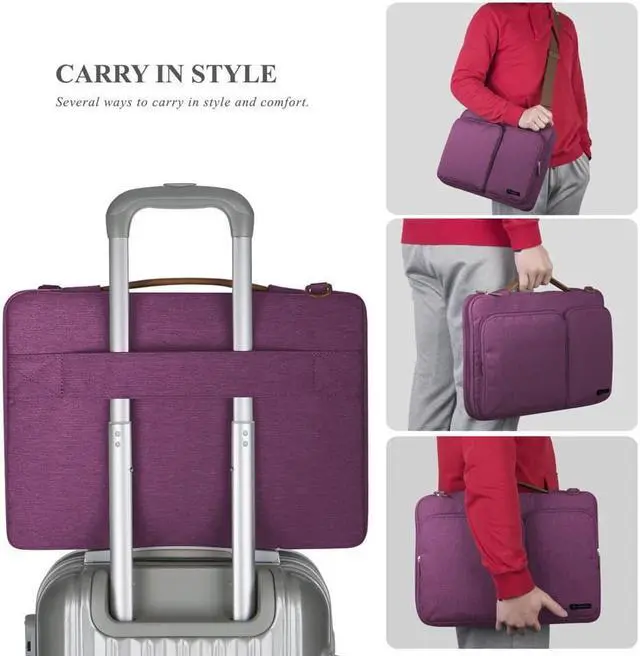 PORTABLE DESIGN -- You can carry this laptop bag in more styles and comfort: (1) On hand by wide soft leather handle;(2) On shoulder or crossbody by by detachable adjustable well-padded shoulder strap;(3) Over trolley suitcase by sturdy luggage strap.