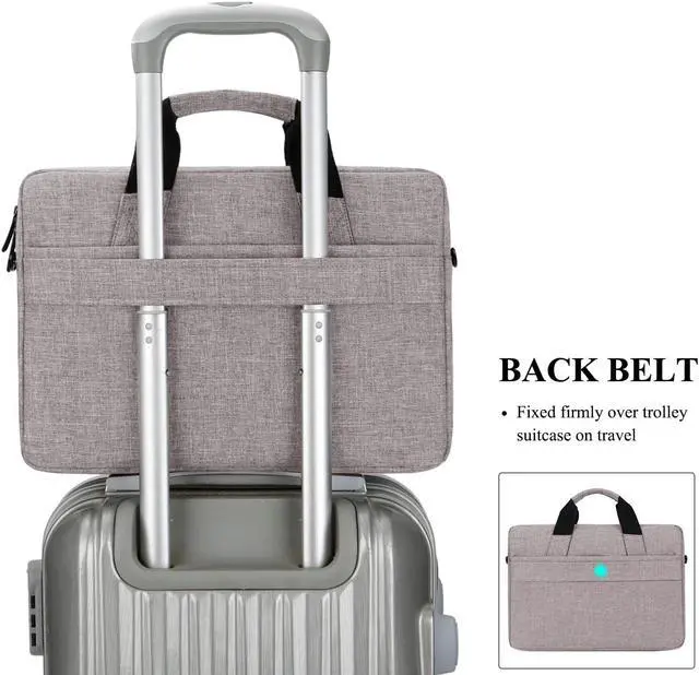 Made of quality anti-tear lightweight fabric, features a thick foam padded laptop sleeve with velcro strap in main compartment, that protects your laptop from accidental bump, shock, scratch. 2 non-zippered pockets can hold mouse, adapter, and middle is very roomy for big items, such as books. Zippered front compartment with 2 small pockets and 2 pen pockets inside is ideal for your phone, pens etc. A back belt is designed on the back, that is easily fixed to trolley suitcase firmly on travel. Comes with a removeable and adjustable PU padded shoulder strap, and dual sturdy handles for long time comfortably carrying