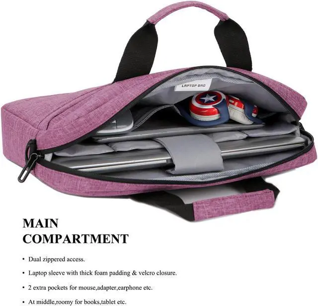 Made of quality anti-tear lightweight fabric,features a thick foam padded laptop sleeve with velcro strap in main compartment, that protects your laptop from accidental bump,shock,scratch. 2 non-zippered pockets can hold mouse,adapter, and middle is very roomy for big items, such as books.