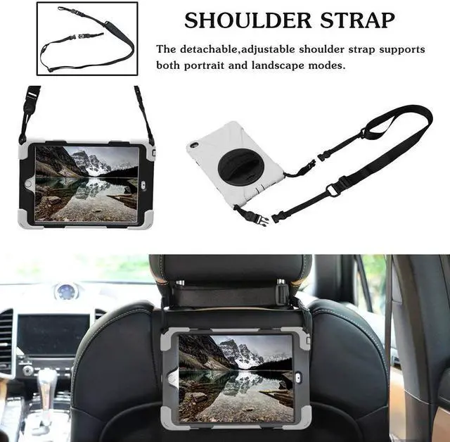 The shoulder belt is adjustable and removable. Your tablet can be slung diagonally or slung over one shoulder, even hung in front of your backseat. Let your backseat passengers enjoy convenient tablet viewing from the back of your car's headrest posts.