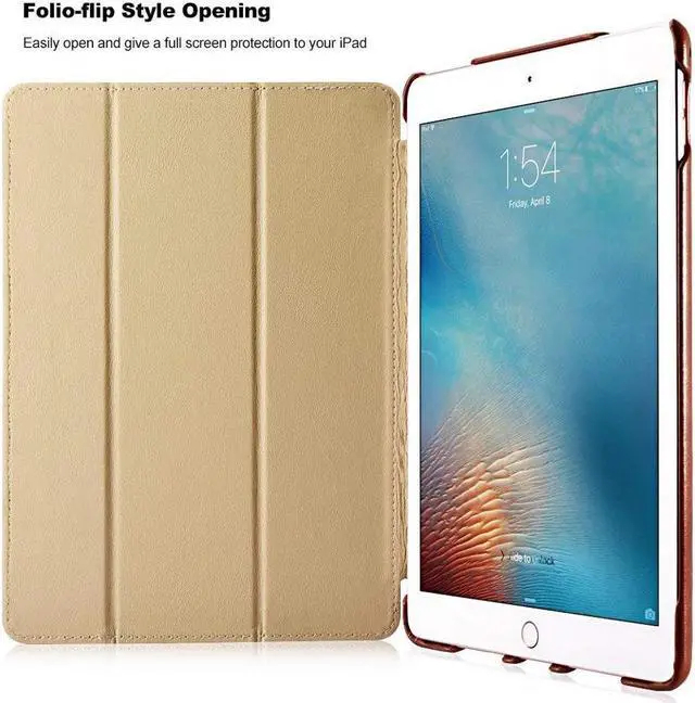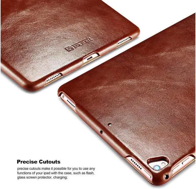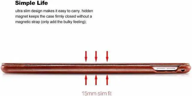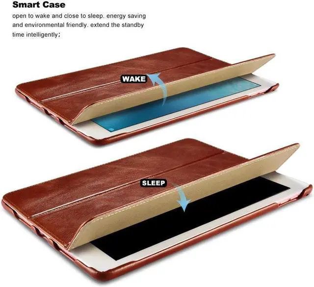 Features: 1-Made of real cowhide leather which hand feeling is comfortable; 2-Built-in magnet to control the auto sleep / wake function; 3-Hidden magnet closure without strap make it slim and easy to carry; 4-Hands-free standing function help you reading or typing with iPad easier; 5-Exquisite cutout make it not effect the usage of iPad;