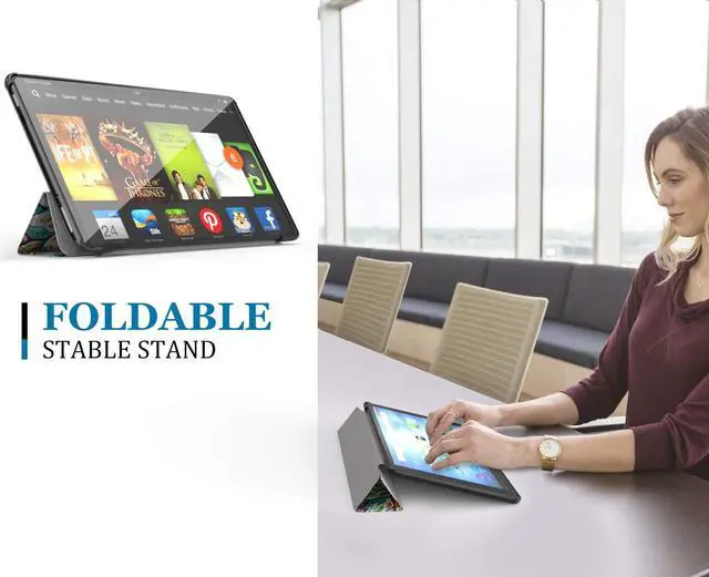 Highlights: Designed to protect and perfectly fit your All-New Fire HD 10 (only compatible with 7th Generation - 2017 Release). Supports auto wake / sleep feature; Magnet secures the case closure, easy snap on and off. Premium PU leather exterior and soft microfiber interior offer great protection against daily use. Multiple angles allow you to adjust your device for comfortable viewing and typing. Unique design allows easy access to all buttons, controls & ports without having to remove the case.