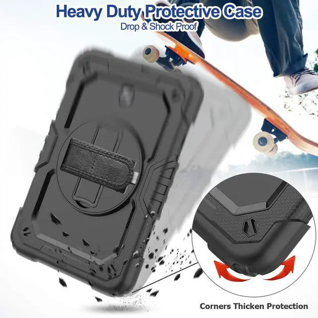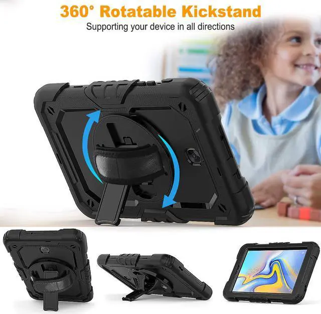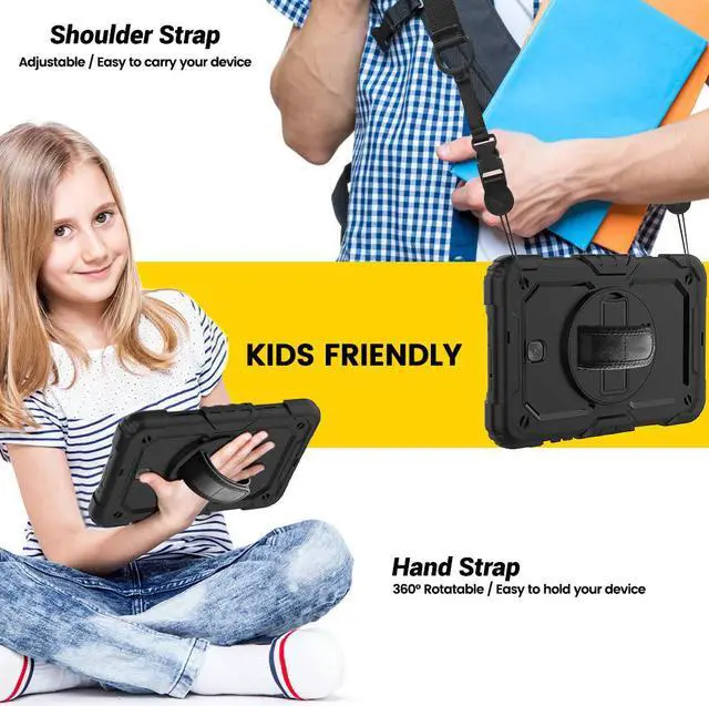 Three Parts: Top PC Frame with built-in screen protector Inner PC bumper lining Soft silicone outer shell Provide all round protection for your tablet. 360 Degree Rotating Kickstand Rotating & Steady stand frees your hands. Rotatable & Adjustable Hand Strap The hand strap can be adjusted with the tightness you like, whether you're an adult or a child. Adjustable & Removable Shoulder Strap With the adjustable and removable shoulder strap, it's convenient when you on a business trip, hiking or any other occasion when you need it. It can be also hung on the car headrest for back-seat passengers' entertainment. Ideal for kids, students. Drop Resistance This t387 case will protect your tablet from dropping, shocking and scratching. Do not need to worry about accidental drop.