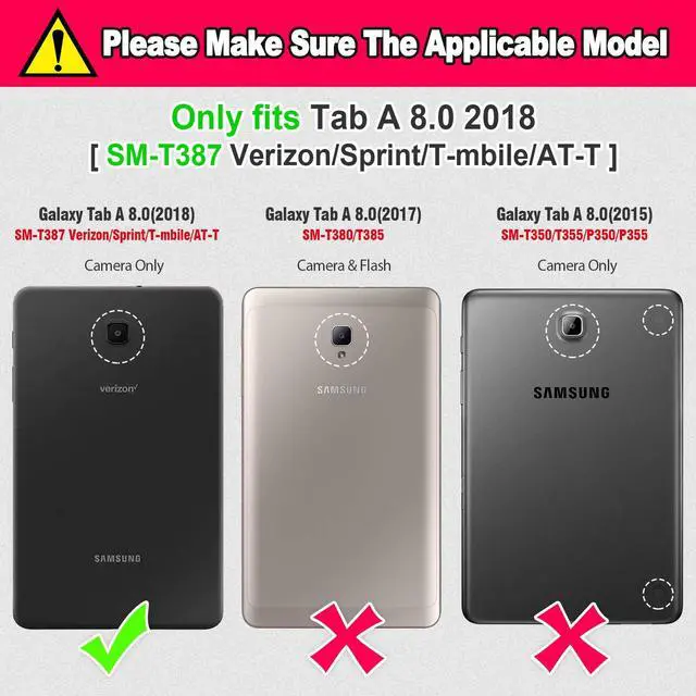 Compatibility: This case ONLY fits Samsung Galaxy Tab A 8.0 SM-T387 Verizon/Sprint/T-Mobile/AT&T 2018 Release. It will not fit 2017 release T380/T385, 2015 release T350/T355/P350/P355, Tab E 8.0 T375/T377, Tab S2 T719/T713 OR any other tablet models. Please confirm the model number and release year of your tablet before purchase.